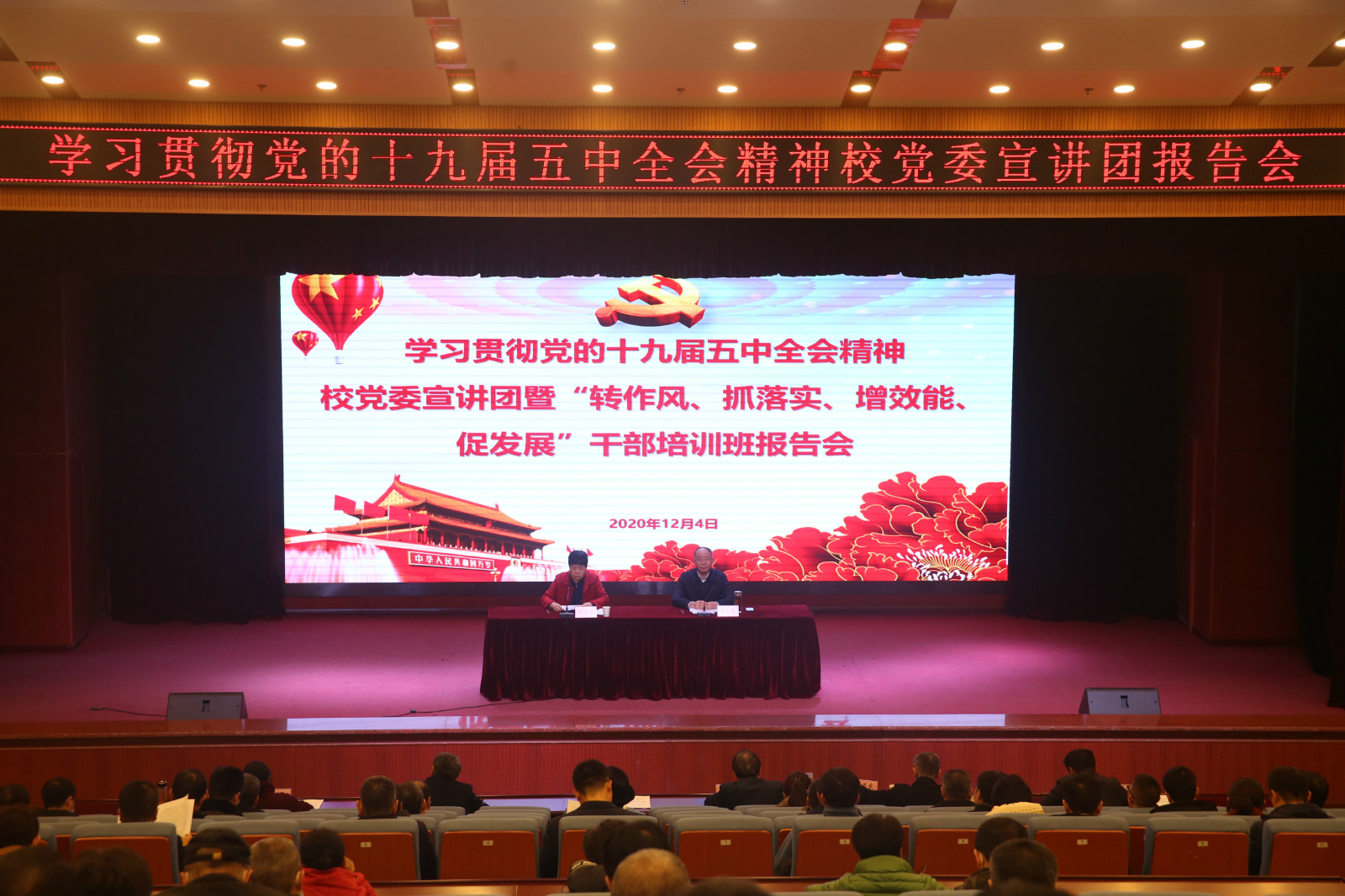 12月4日下午,学校在郭杜校区学术报告厅举办学习贯彻党的十九届五中全会精神校党委宣讲团暨“转作风、抓落实、增效能、促发展”干部培训班报告会。陕西高校党委宣讲团成员、校党委宣讲团成员、校党委书记王家春作题为《把握新阶段贯彻新发展理念,构建新发展格局——学习贯彻五中全会精神,推动学校事业高质量发展》的宣讲报告,党委理论学习中心组成员、全体处级干部、各党总支和党支部委员、教师代表、学生代表参加。校长许春霞主持报告会。