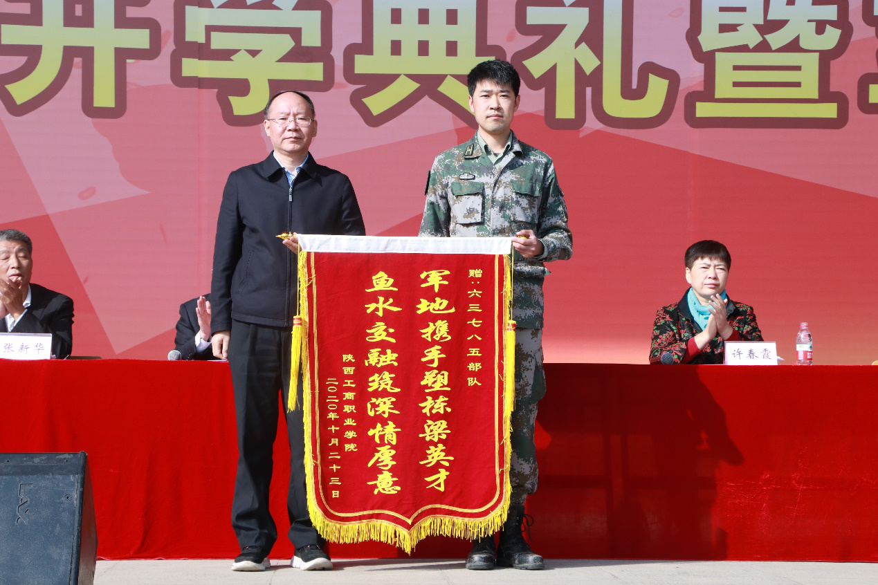 校党委书记王家春代表学校向军训团赠送“军地携手塑栋梁英才 鱼水交融筑深情厚意”锦旗。