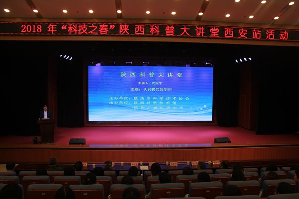4月17日下午,由省科协、省科技馆举办,学校承办的2018年科技之春陕西科普大讲堂“西安站”活动开展,中国科学院院士武向平,应邀在郭杜校区学术报告厅作“认识我们的宇宙”科普报告。学校纪委书记杨宏民,学术委员会主任、原校党委副书记莫翼翔教授到场聆听,省科技馆馆长王晓东主持报告会。40余万观众通过省科普平台实时收看了报告会直播,学校400余名师生代表有幸现场接受了前沿科学的滋养。