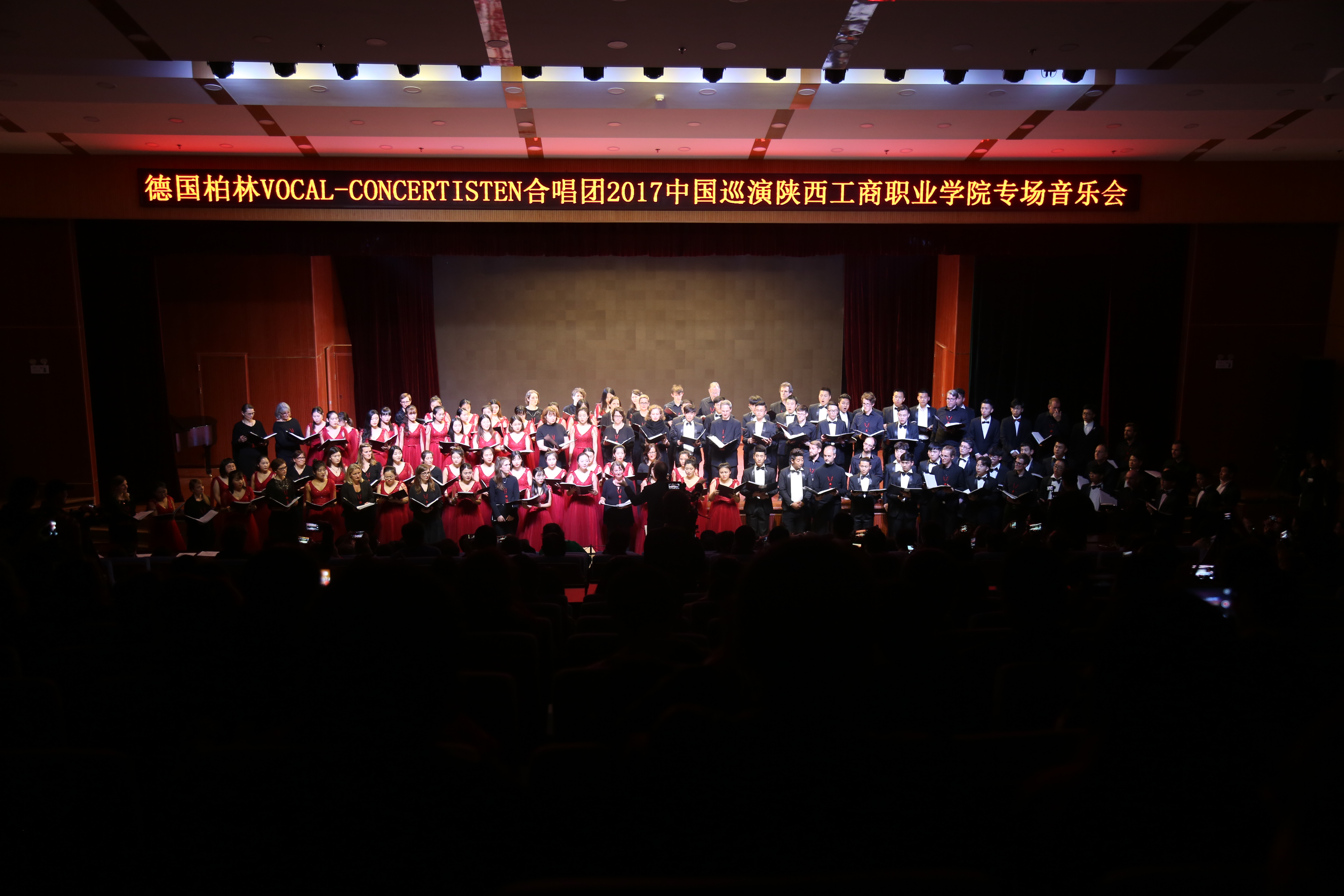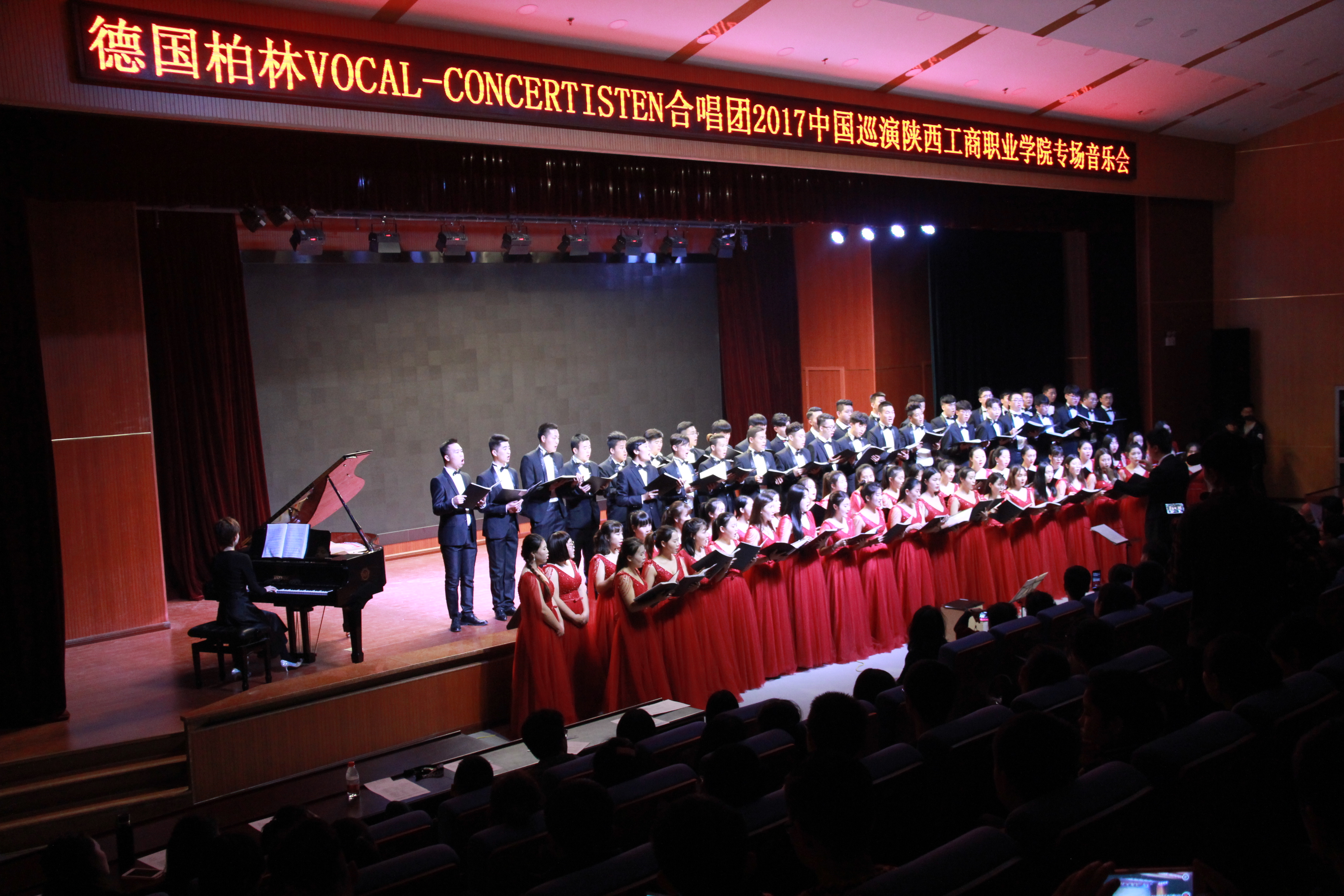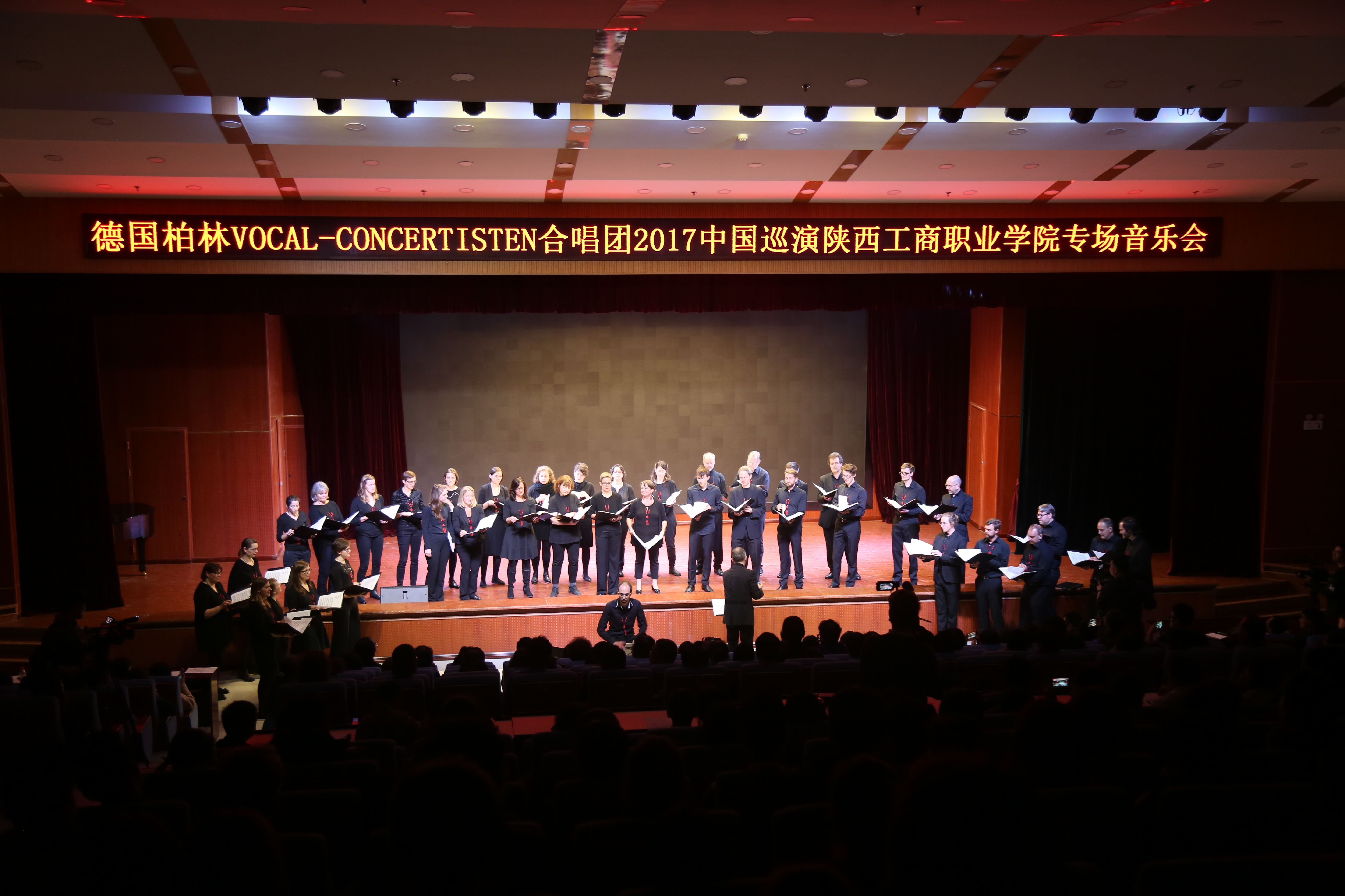 以“今日中国——合作·友谊·共赢”为主题的中德建交45周年系列文化活动之一——为期两周的柏林VOCAL-CONCERTISTEN合唱团中国巡演于10月21日至11月2日在国内各地举行,西安交流演出期间,郭杜校区综合楼学术报告厅举办了柏林VOCAL-CONCERTISTEN合唱团中国巡演陕西工商职业学院专场音乐会。10月24日19:00——21:00,来自柏林VOCAL-CONCERTISTEN合唱团的48名艺术家与本校大学生合唱团、陕西艺术职业学院大学生合唱团共同上演一场既具国际性、专业性,又充满异域特色的合唱音乐会。学校领导、师生以及来自西安音乐学院、陕西师范大学、西安邮电大学、西安电子科技大学、陕西学前师范学院等高校的专家及其合唱团大学生一同观看了演出。